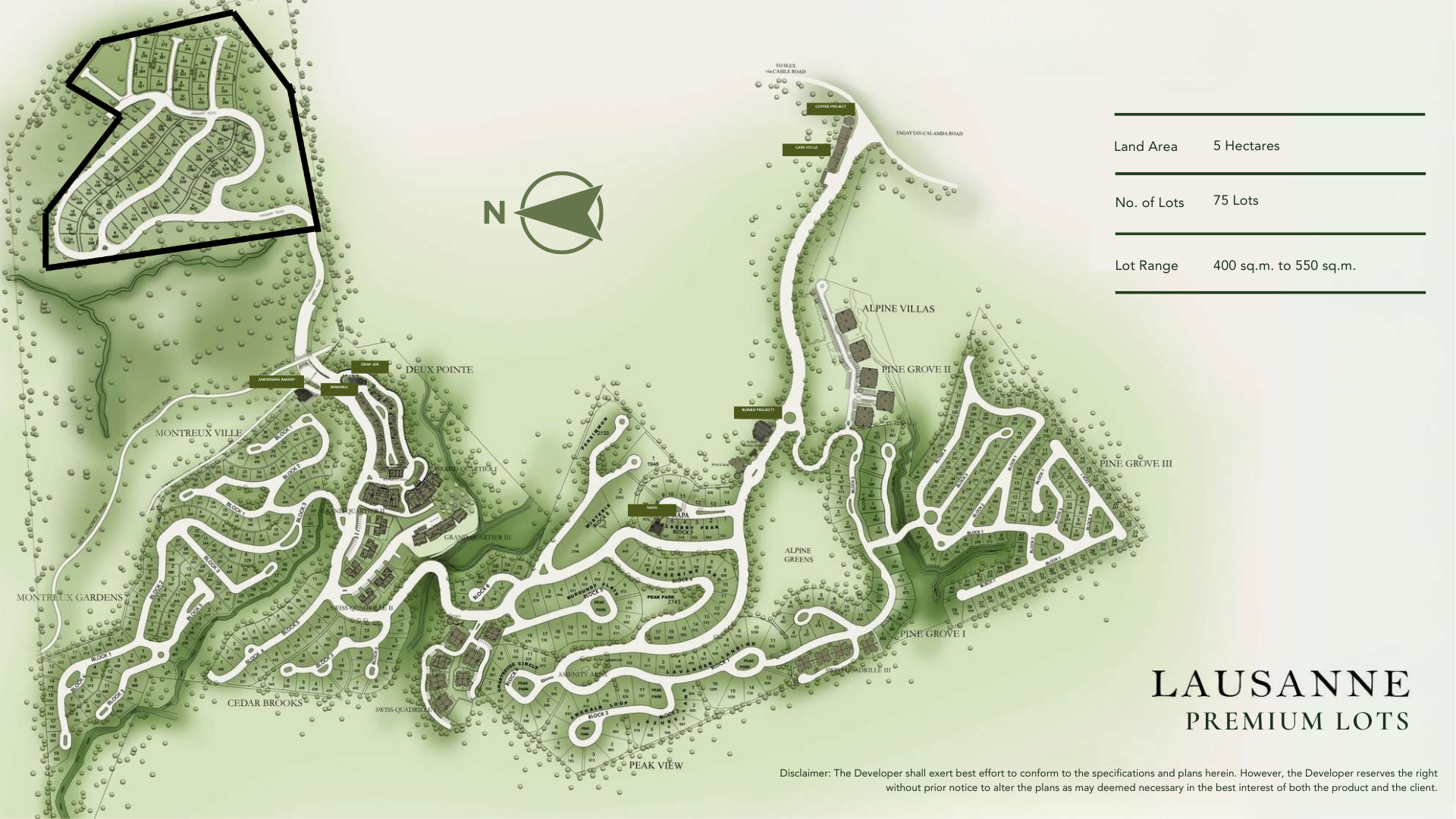 Lausanne is one of the last available residential enclaves inside Crosswinds Tagaytay — with direct access to its pine forest environment, restaurants, and lifestyle amenities. You're not just buying land. You're securing a position inside a fully realized mountain estate.