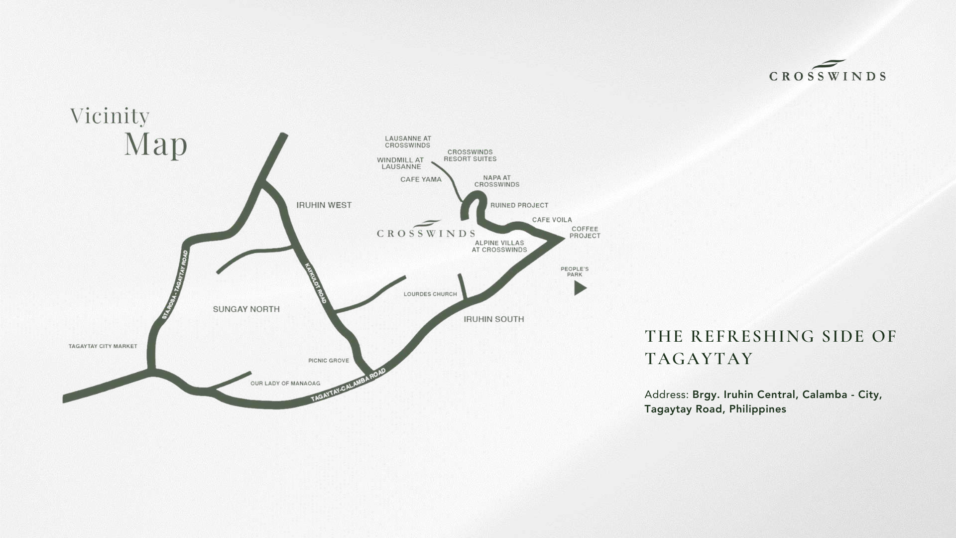 Approximately 1 hour from BGC via CALAX. Far enough to disconnect from the city — close enough for a spontaneous weekend. At around 800 meters above sea level, Crosswinds offers a noticeably cooler climate year-round, a shift you feel the moment you arrive.
