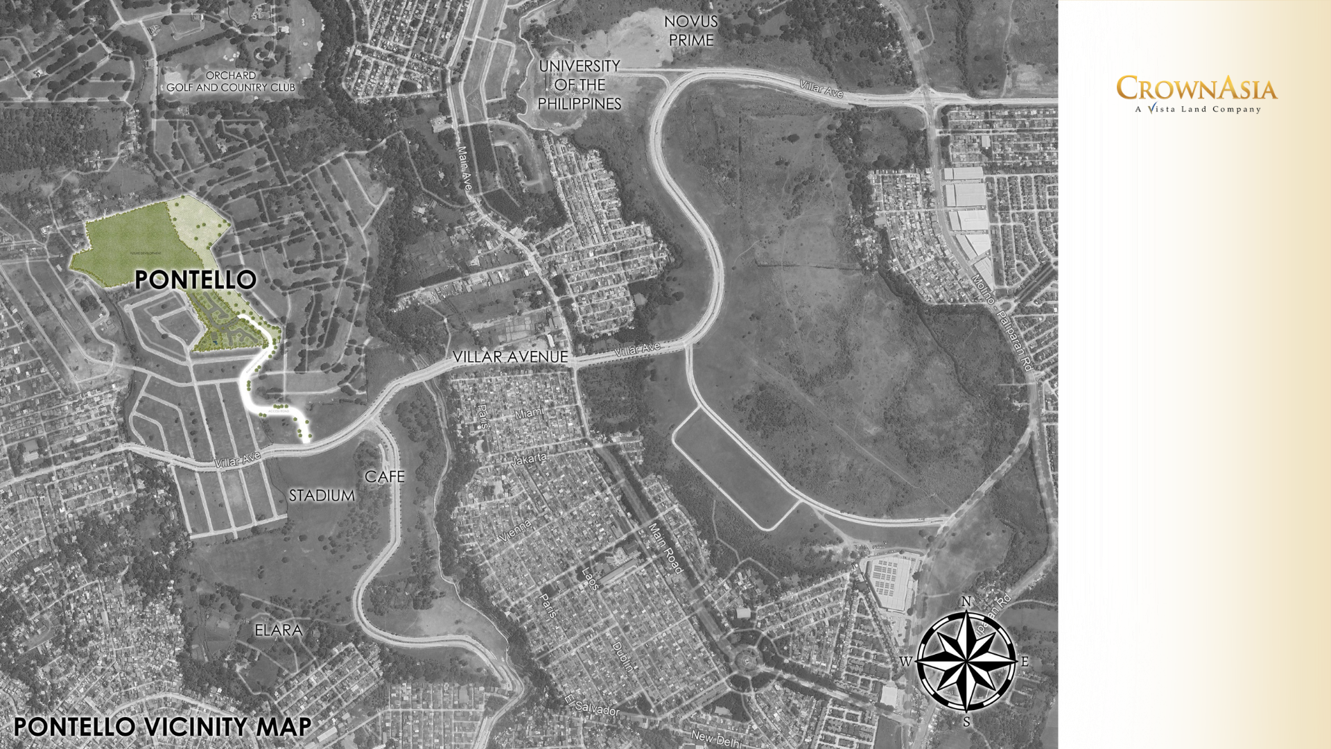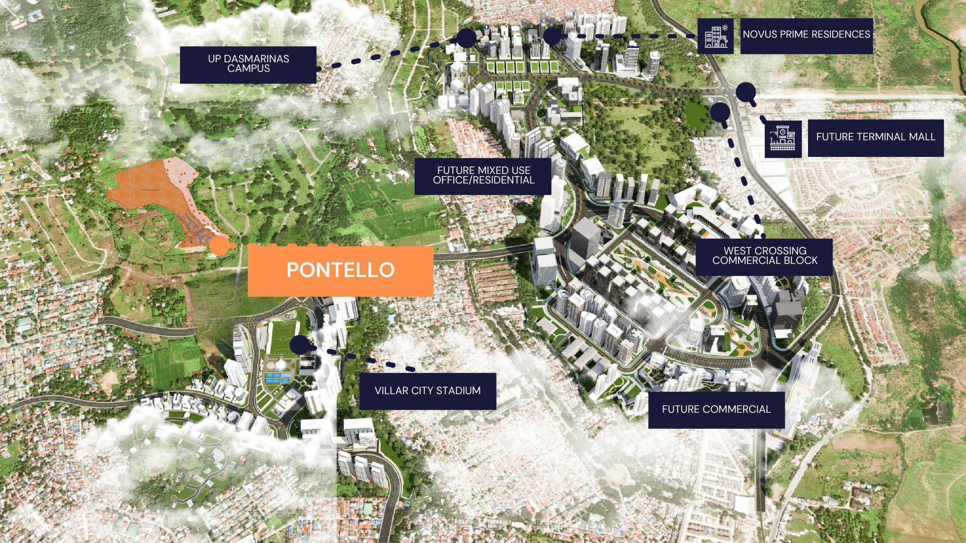 Pontello benefits from Villar City's strategic road network: Muntinlupa-Cavite Expressway (MCX) is just 4 km away, Daang Reyna at 2 km, Daang Hari at 15 km, and Villar Avenue at 18 km. Within the ecosystem: UP Dasmariñas campus, West Crossing commercial block, Evia Lifestyle Center, SOMO Vista Mall, Brittany Palazzo and Hotel, Villar City Golf Course, and the future Villar City Stadium. University Town itself is a 150-hectare academic district with a 1.1 million catchment population.